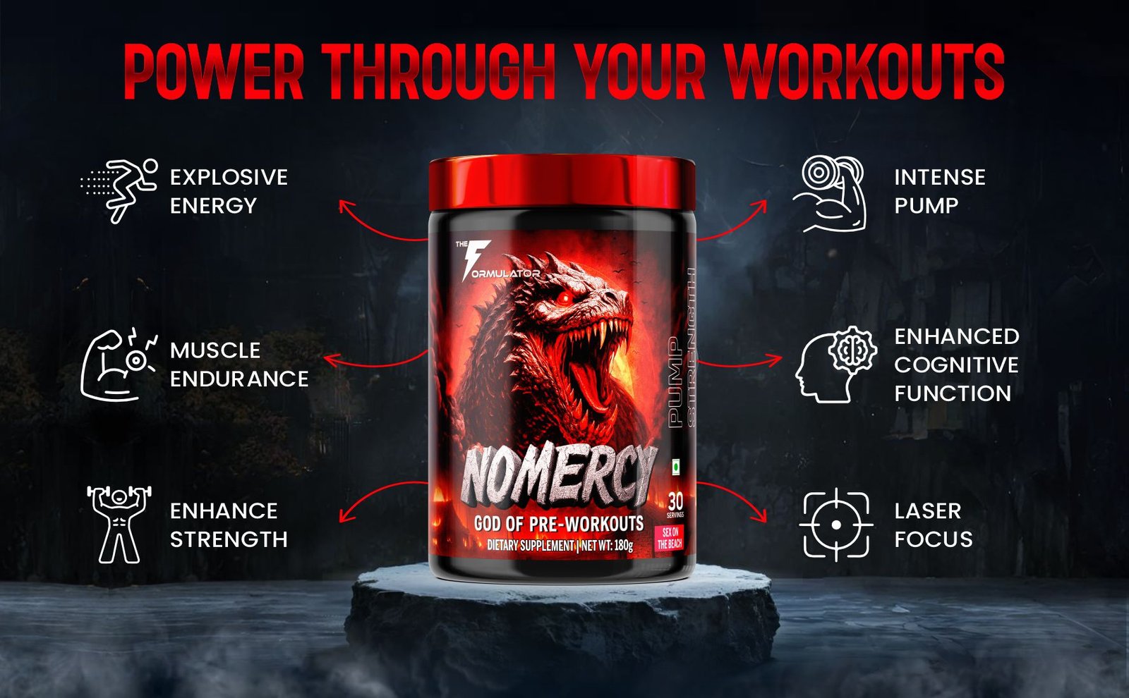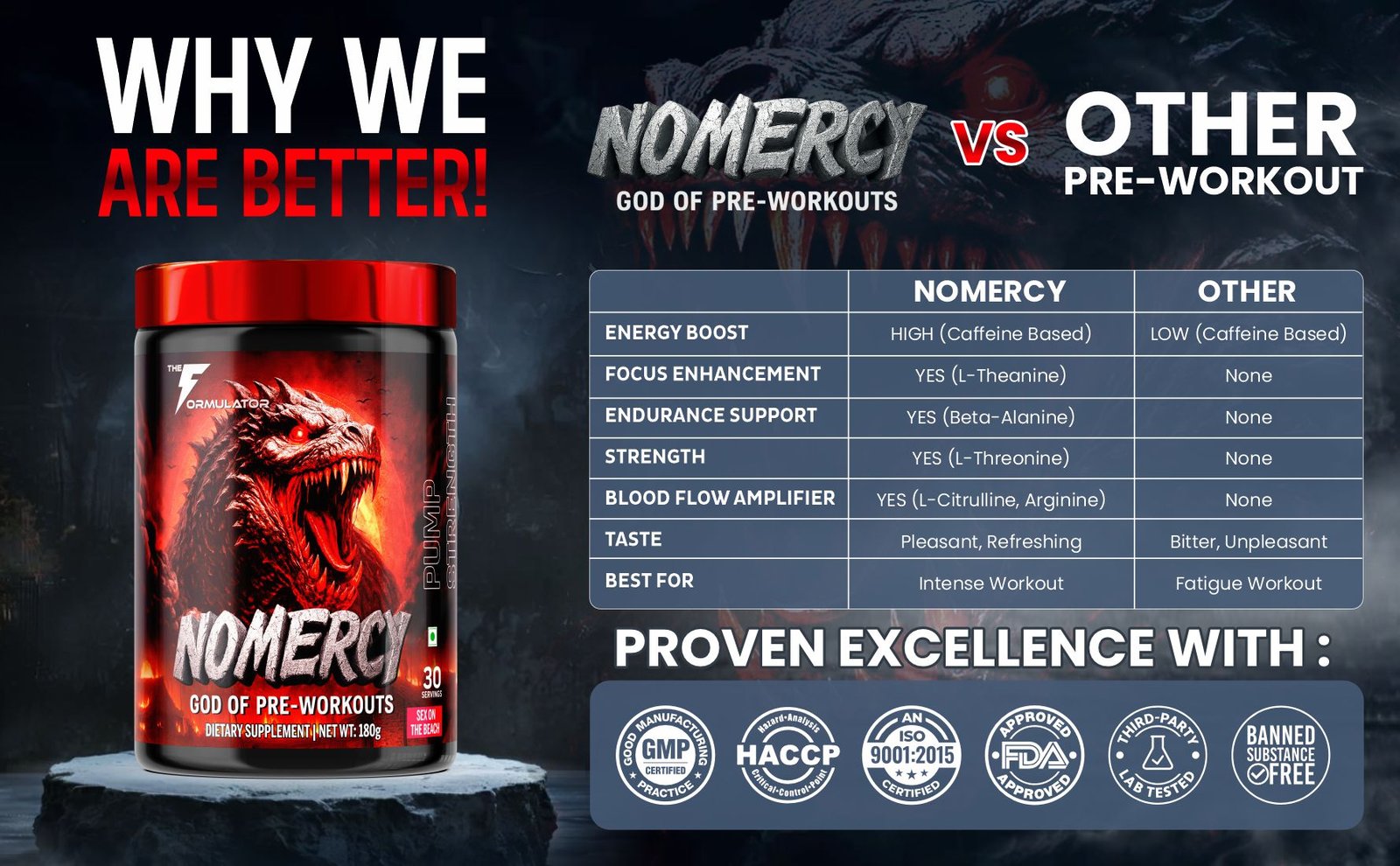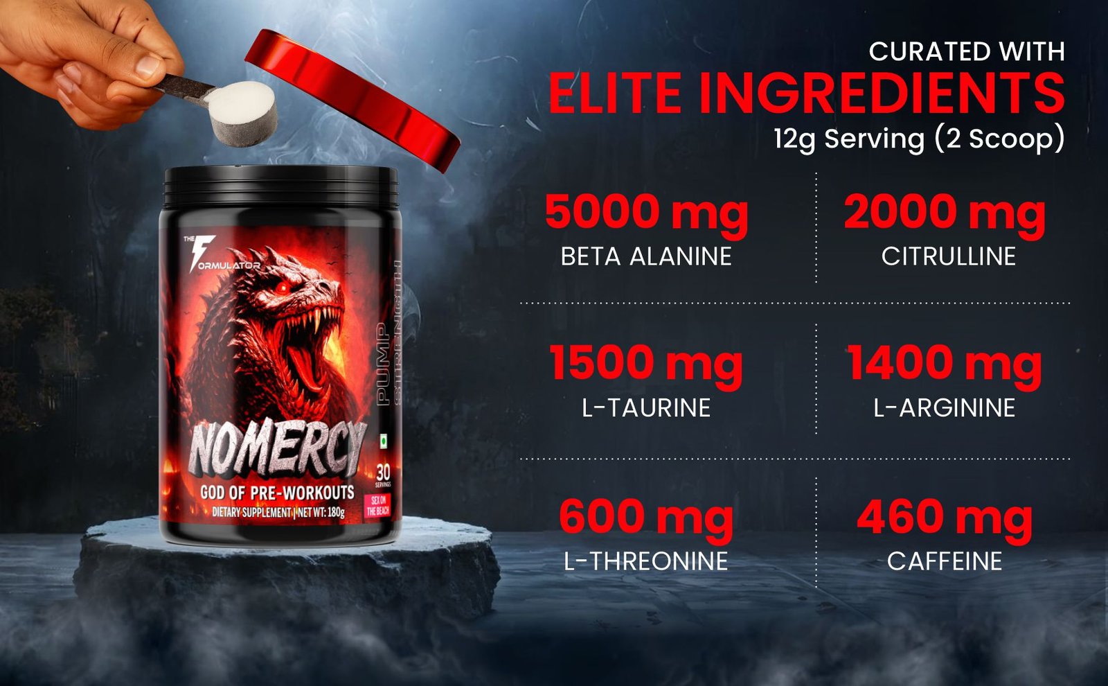Prepare to dominate your training sessions with NOMERCY, the “God of Pre-Workouts” from The Formulator. This is not just another pre-workout; it’s a scientifically-designed weapon for those who demand peak performance and refuse to settle. NOMERCY is engineered with a precise matrix of potent ingredients to deliver an unparalleled synergy of intense energy, powerful muscle pumps, and unwavering mental focus.