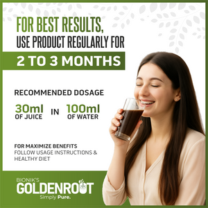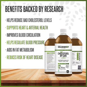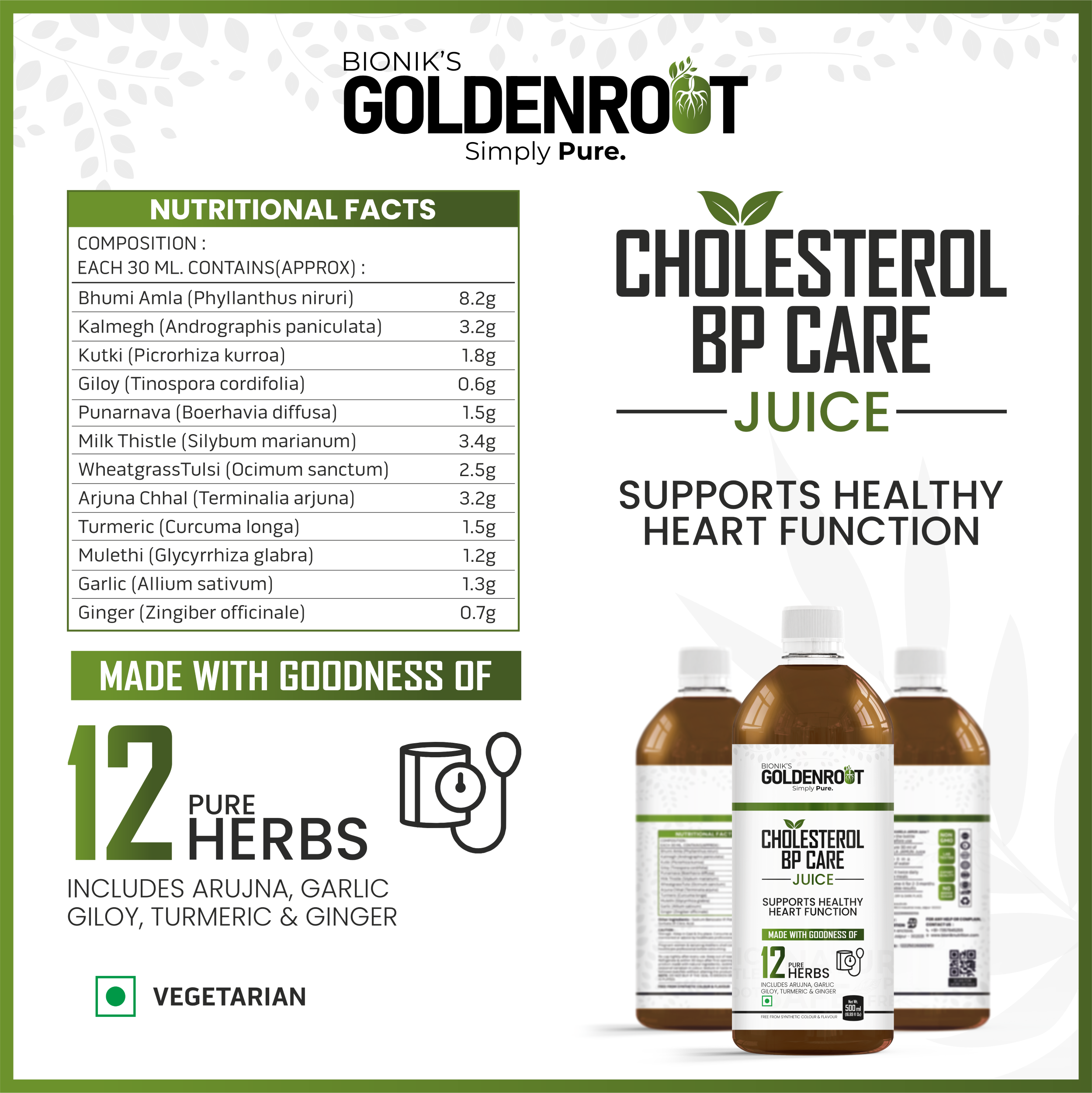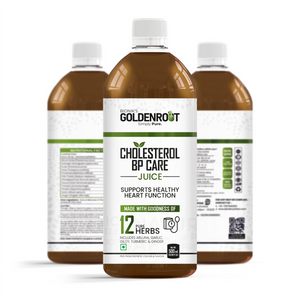 Bionik’s GoldenRoot Cholesterol BP Care Juice is a powerful Ayurvedic heart health formulation crafted with Arjuna, Garlic, Turmeric, Kutki, Wheatgrass, Tulsi, Giloy, Milk Thistle & 10+ natural herbs.