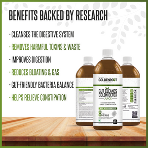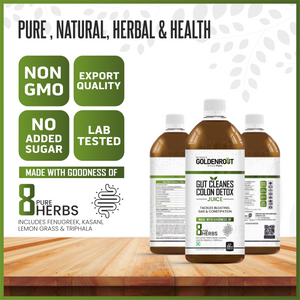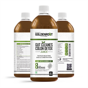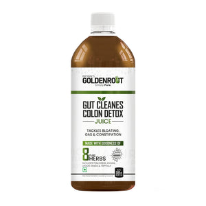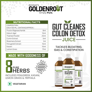 Bionik’s GoldenRoot Gut Cleanse & Colon Detox Juice is a gentle yet powerful Ayurvedic digestive cleansing tonic made with Triphala, Kokum, Kasani, Fenugreek, Cumin, Lemongrass, Rosemary and other gut-friendly herbs.
