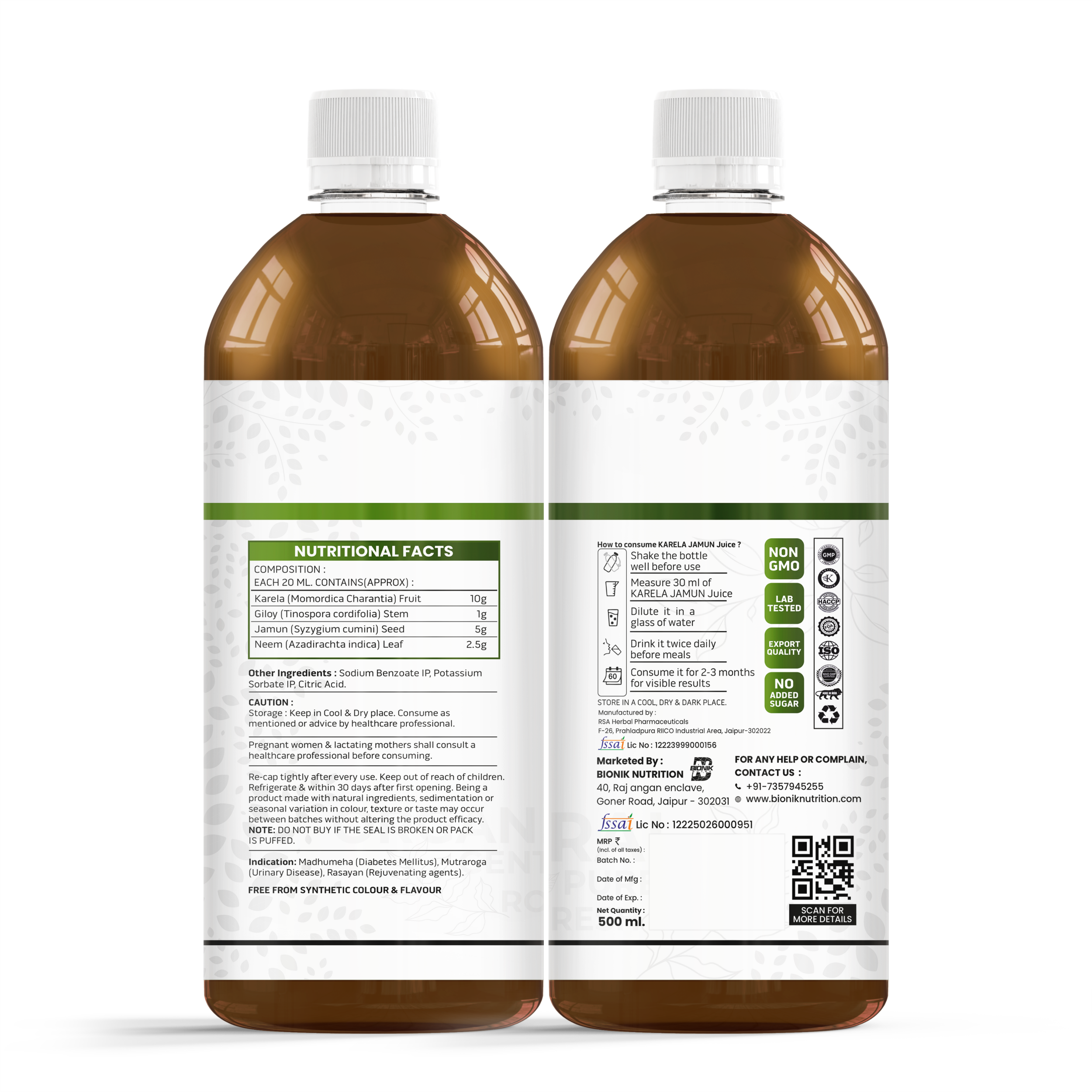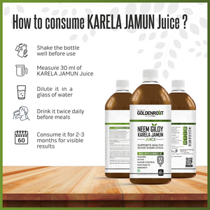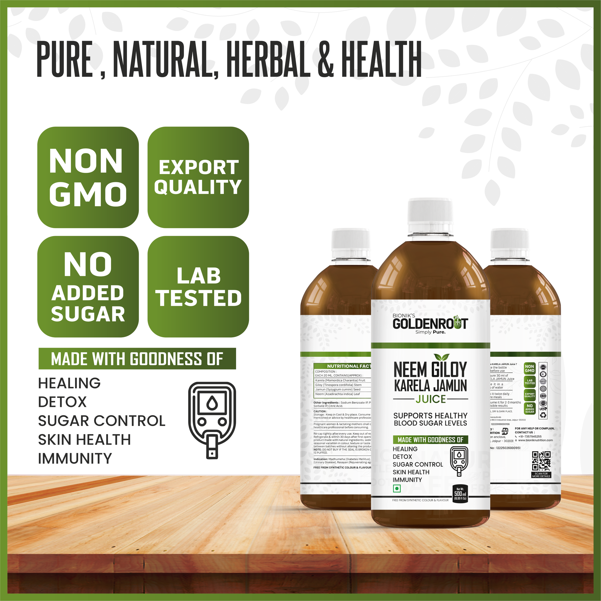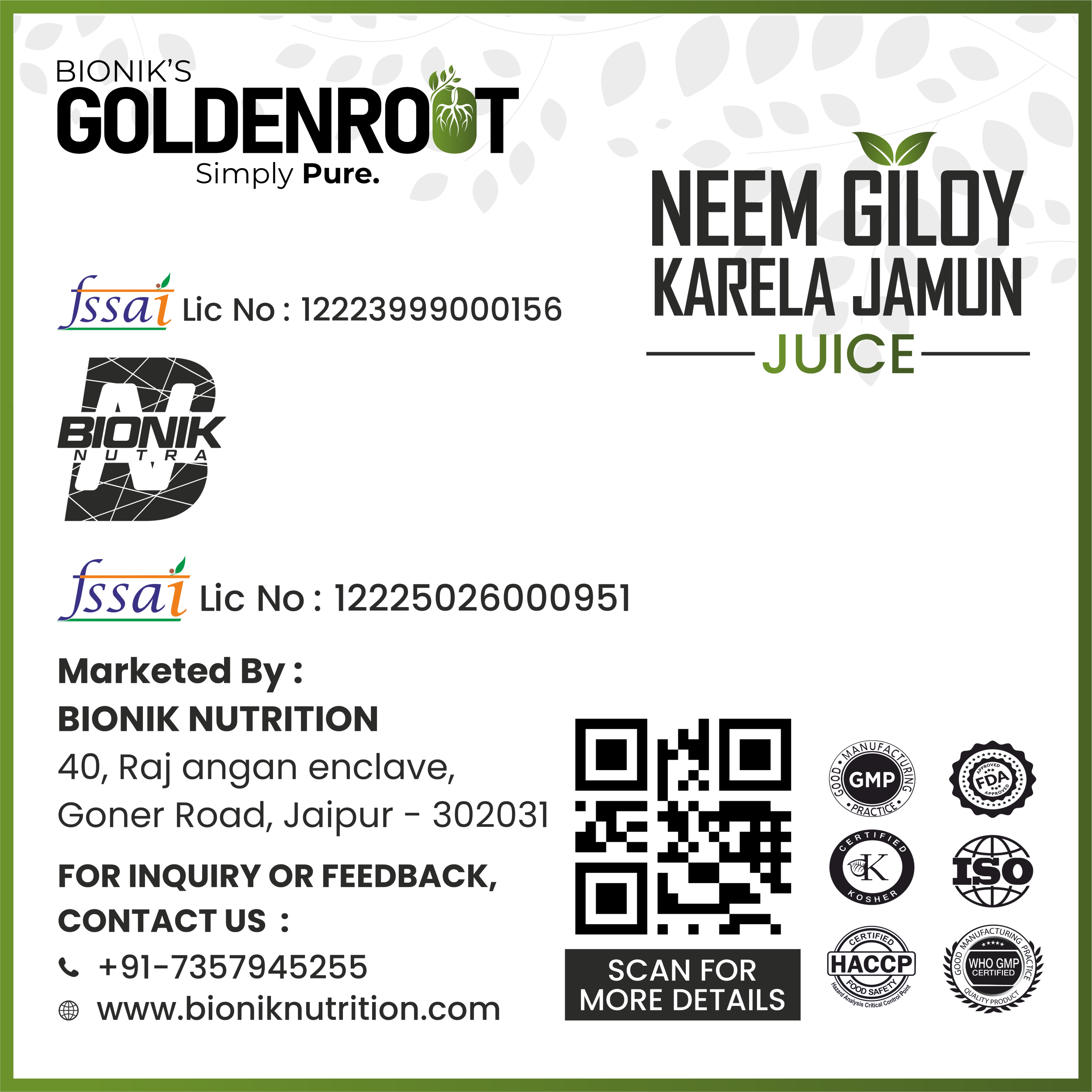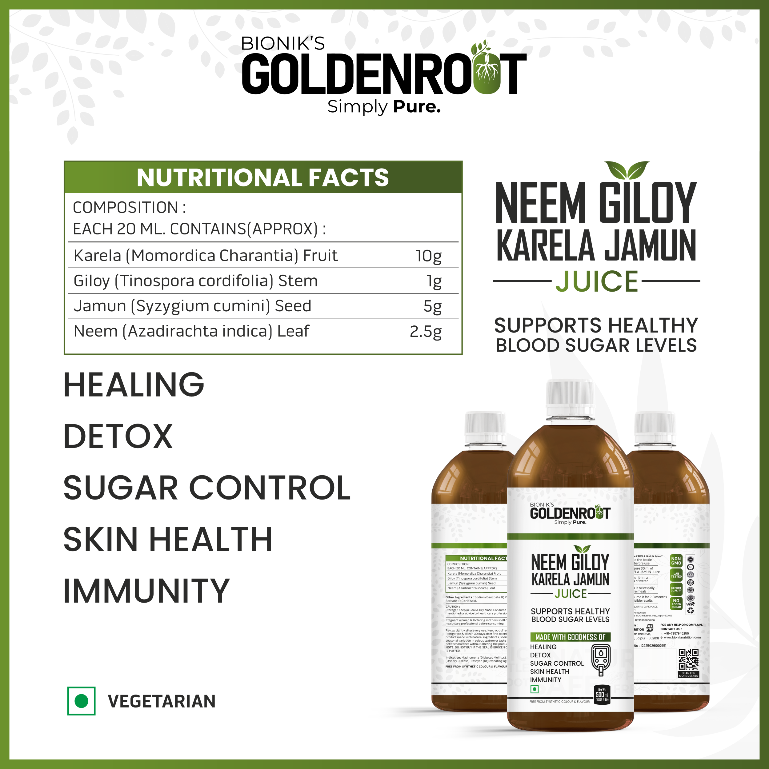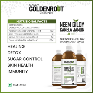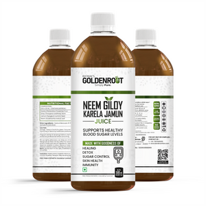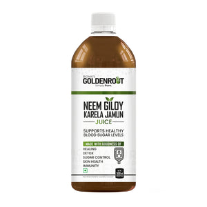 Bionik’s GoldenRoot Neem Giloy Karela Jamun Juice is a powerful Ayurvedic formulation crafted with Karela (bitter gourd), Jamun seed extract, Giloy stem extract and Neem leaves—four of the most trusted and time-tested herbs for blood sugar balance, detoxification, digestion and immunity.