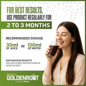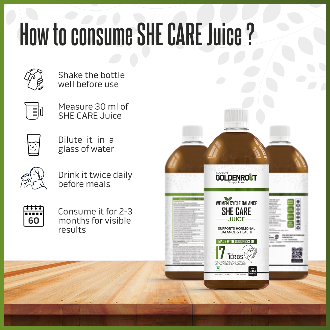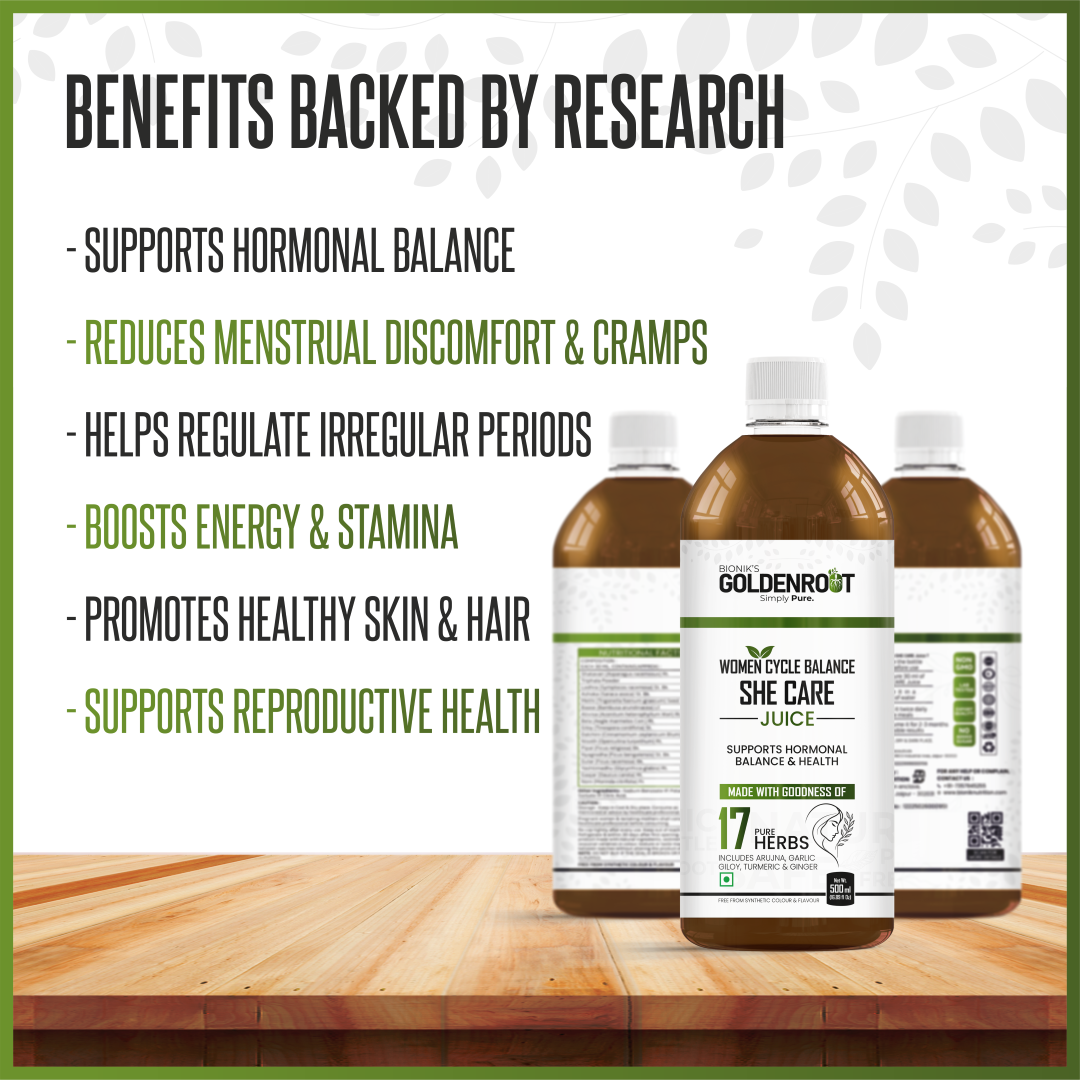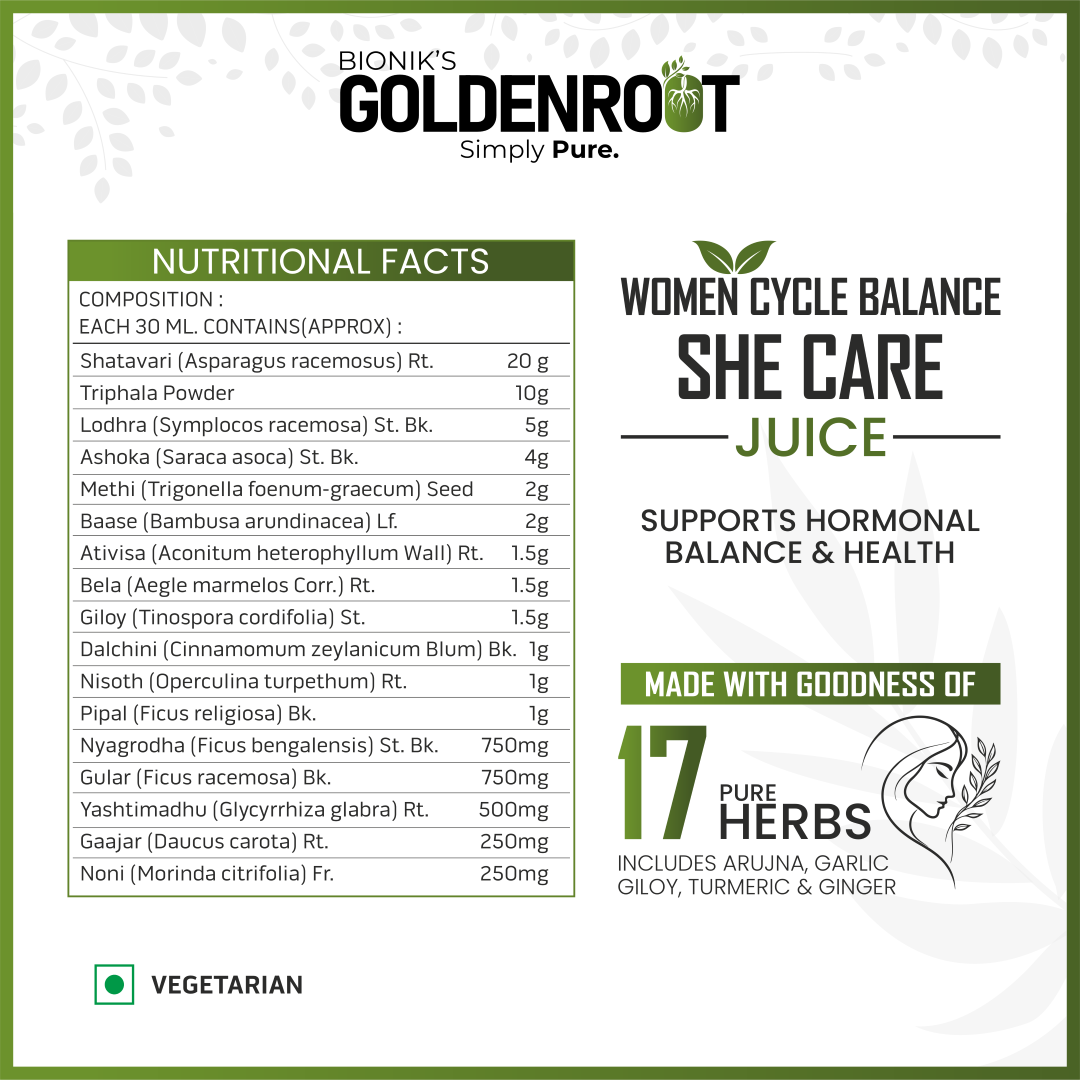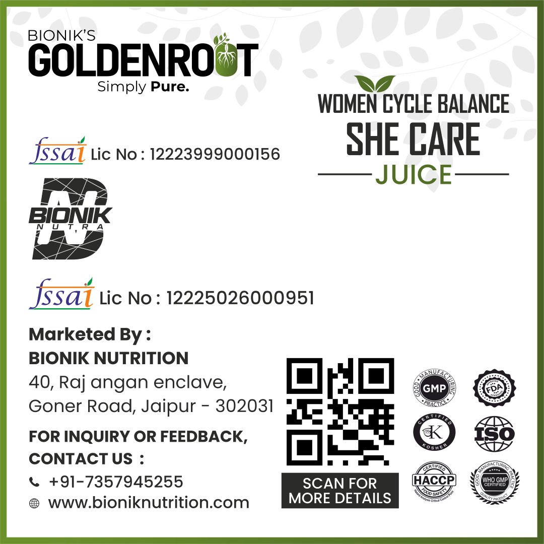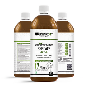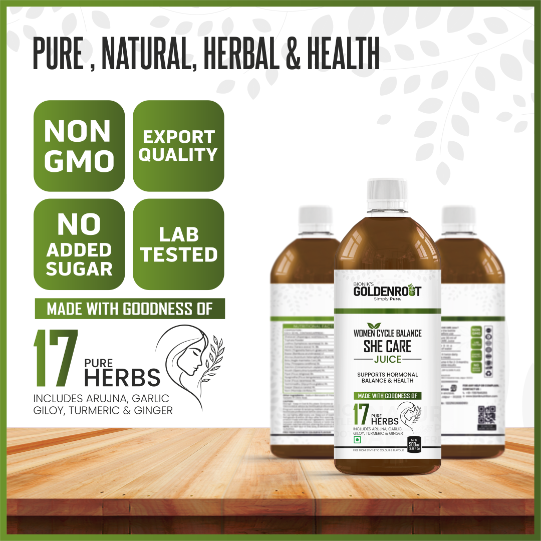 Bionik’s GoldenRoot She Care Juice is a scientifically crafted Ayurvedic formulation made with 17 premium herbs that have been used for centuries to support female reproductive health, hormonal balance, and menstrual cycle regulation.