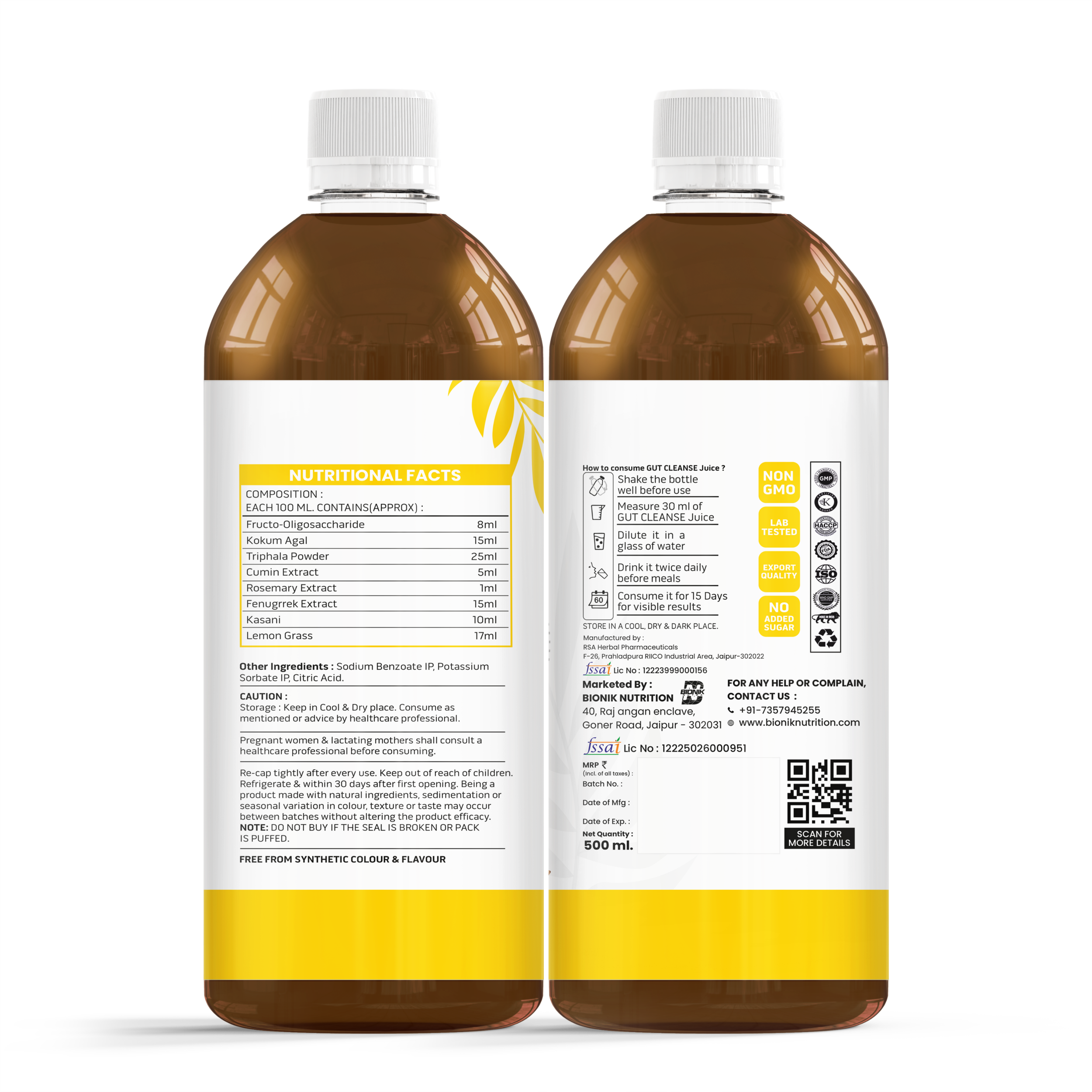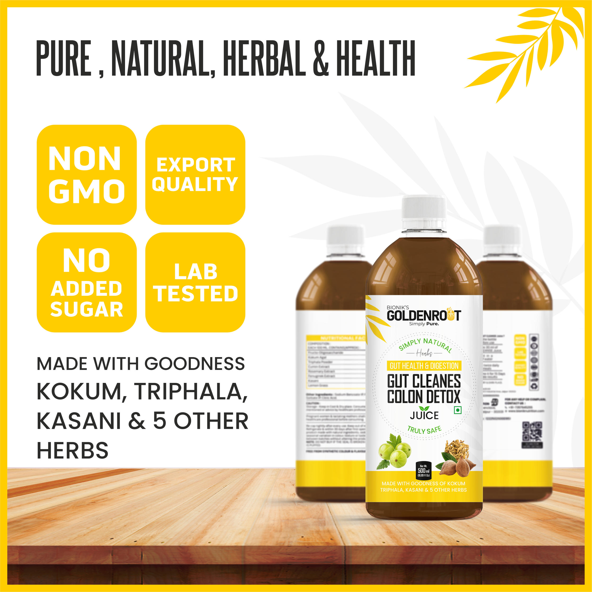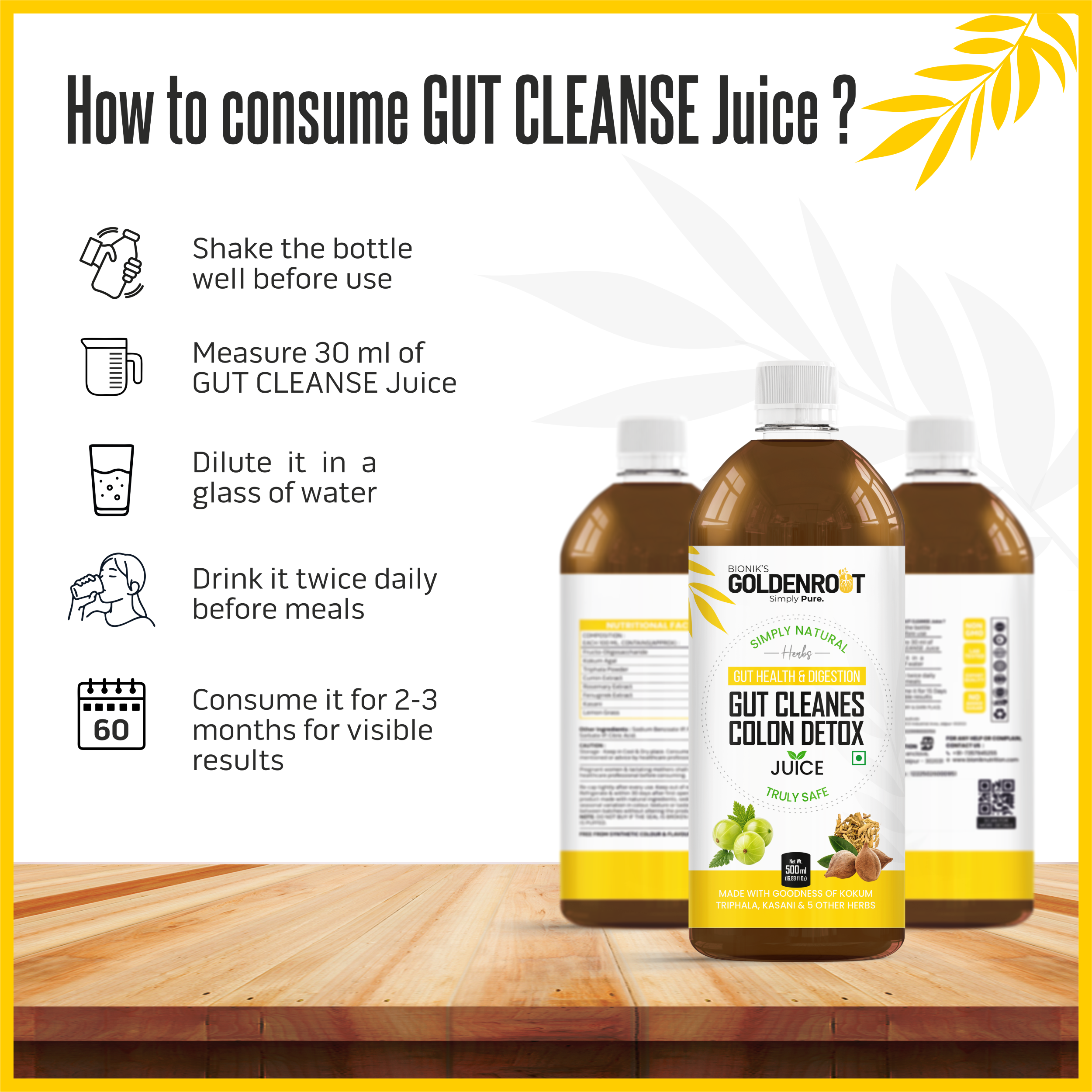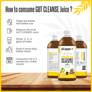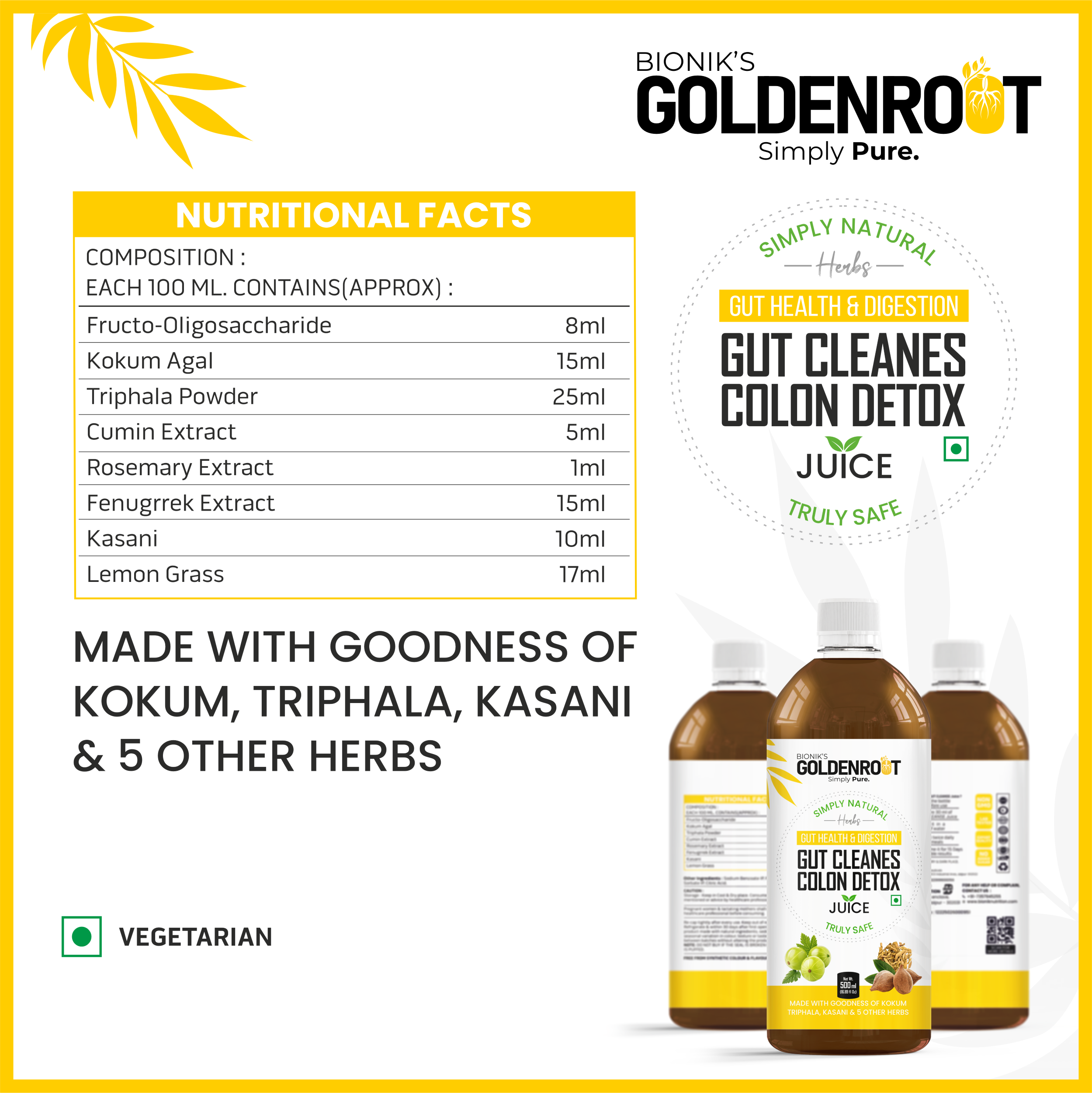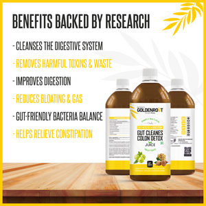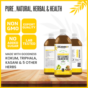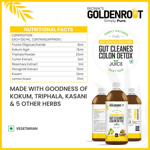 Bionik’s GoldenRoot Gut Cleanse & Colon Detox Juice is a gentle yet powerful Ayurvedic digestive cleansing tonic made with Triphala, Kokum, Kasani, Fenugreek, Cumin, Lemongrass, Rosemary and other gut-friendly herbs.
