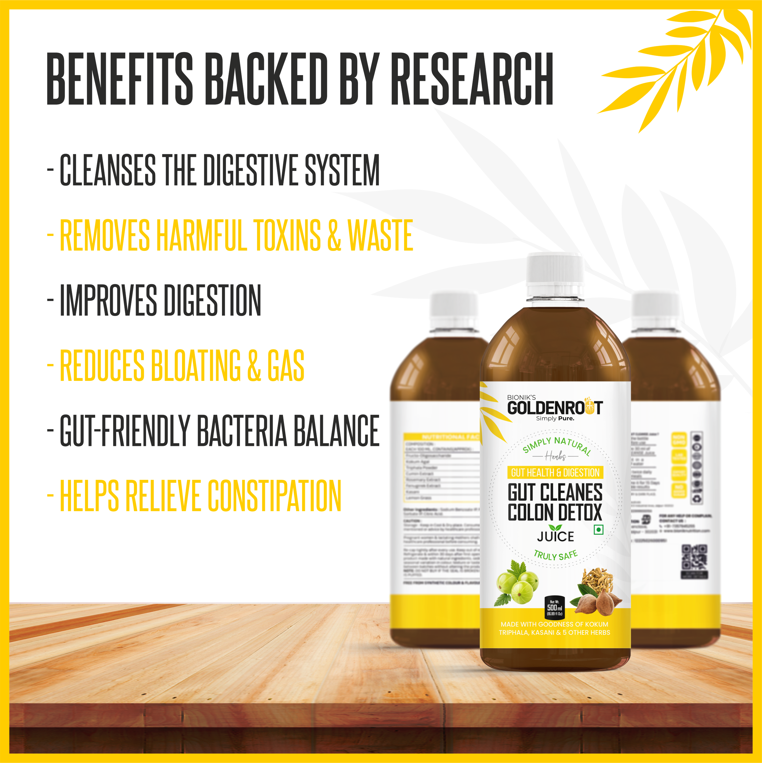 Bionik GoldenRoot Gut Cleanse & Colon Detox Juice | Ayurvedic Digestive Cleanser with Triphala, Kokum, Lemongrass, Kasani & 5 Herbal Extracts | Supports Digestion, Bloating Relief & Gut Health